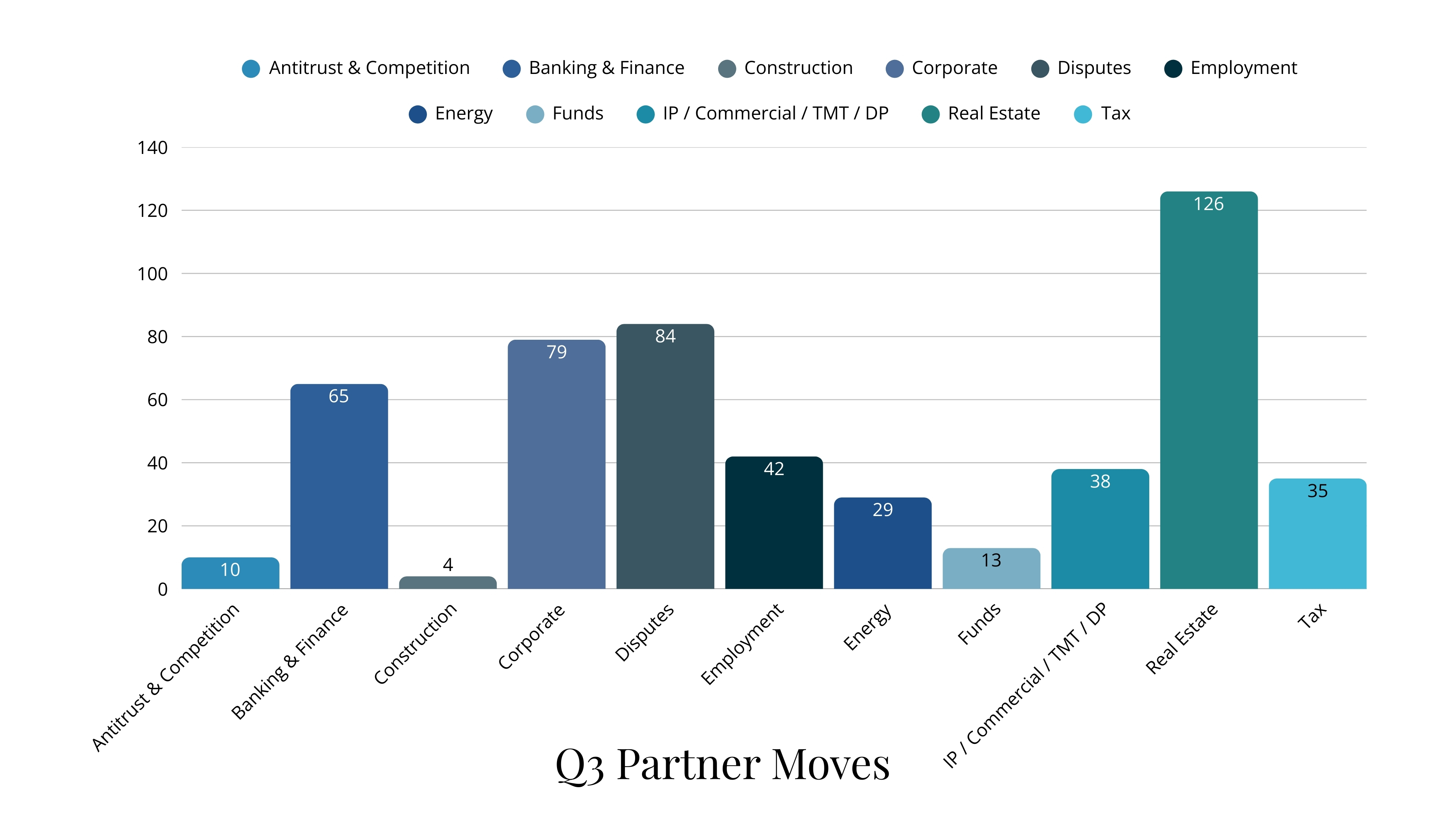 By contrast, corporate hiring softened during the quarter. This was less a reflection of reduced confidence in the practice and more indicative of timing. Many firms had already addressed immediate corporate leadership needs earlier in the year, reducing the urgency for further lateral hires in Q3. Where corporate appointments did occur, they were typically targeted and opportunistic rather than programmatic.